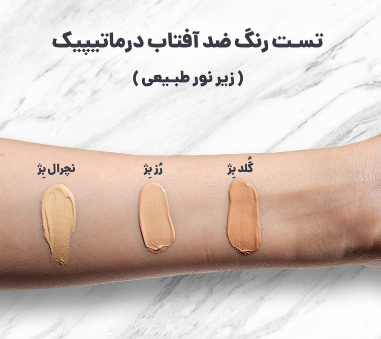 کرم ضد آفتاب درماتیپیک همان محصولی است که میتواند به خوبی از پوست شما در برابر اشعههای مضر خورشید مراقبت کند تا دچار اثرات مضر اشعههای UV خورشید نشوید. این ضد آفتاب برای انواع پوست (چرب، خشک، معمولی و...) عرضه میشود و دارای دو نوع رنگی و بدون رنگ است. اما ضد آفتاب درماتیپیک چند رنگ دارد؟ این محصول با سه رنگ شامل کرم ضد آفتاب درماتیپیک بژ طبیعی (نچرال بژ)، بژ طلایی (گلد بژ) و رز بژ ارائه میشود و شما باید رنگ مناسب پوست خود را انتخاب کنید.